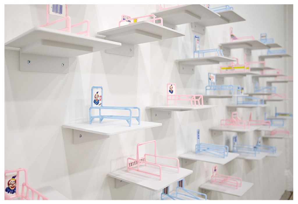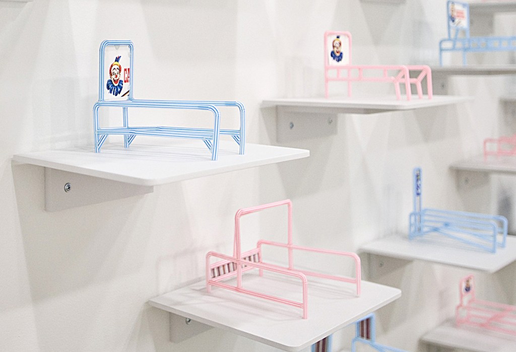 Cart Corrals Cart Corrals, 2009. Flexible drinking straws, archival inkjet print on photomount, hot glue. Custom shelves: MDF, paint Each shelf is a custom shape, skewed from center to enhance the “fisheye” effect of the installation. Related