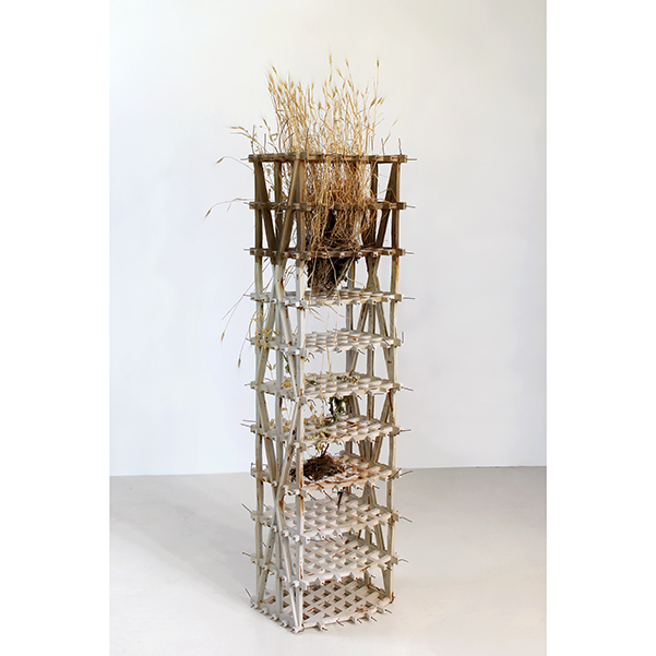 Connections between ambition and appetite, unchecked growth and ruin, hunger and sustainability. These are sculptures in the form of architectural fragments, structures that support the live growth of food crops such as wheat, corn, and beans. Over the course of a growing season the gypsum-based structures and plants become enmeshed, dried out – roots and all. They point to what anthropologist Anna Tsing calls “more-than-human entanglements,” where organic growth and cultural artifacts become hybridized and unruly.