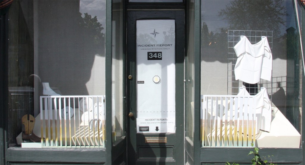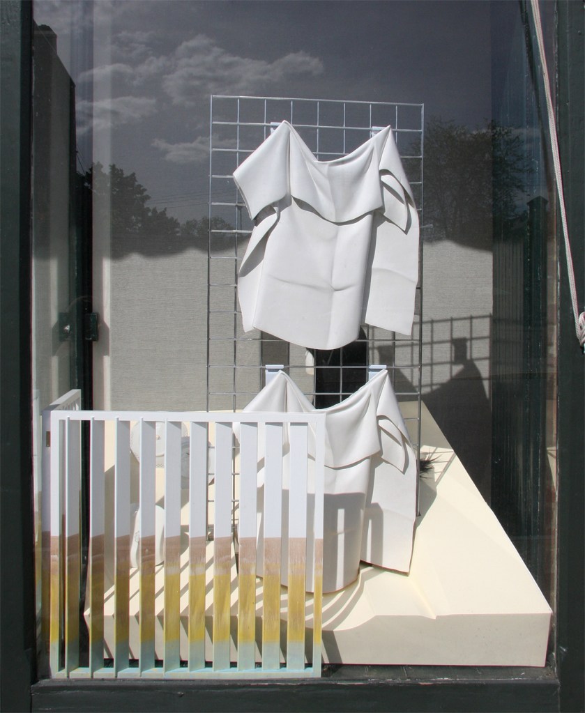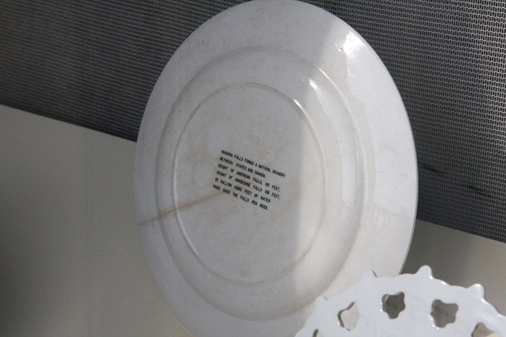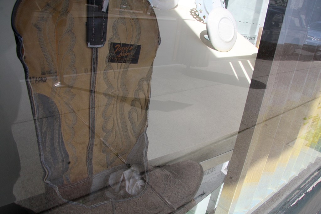 An installation at Incident Report, the experimental storefront venue curated by Nancy Shaver and Maximillian Goldfarb in Hudson, NY’s antique district. The piece includes a collection of Niagara Fall’s commemorative plates (turned backwards), a western boot, a wig, and plaster casts based on Raphael Peale’s Venus Rising From the Sea – A Deception, 1822.