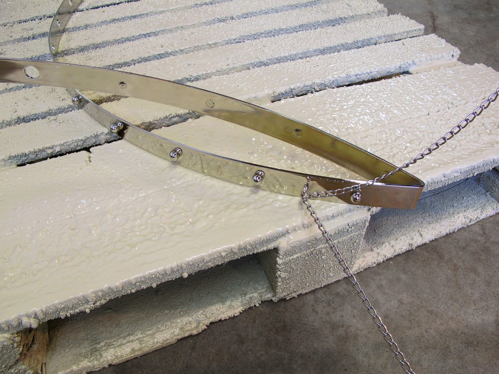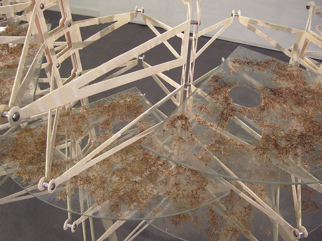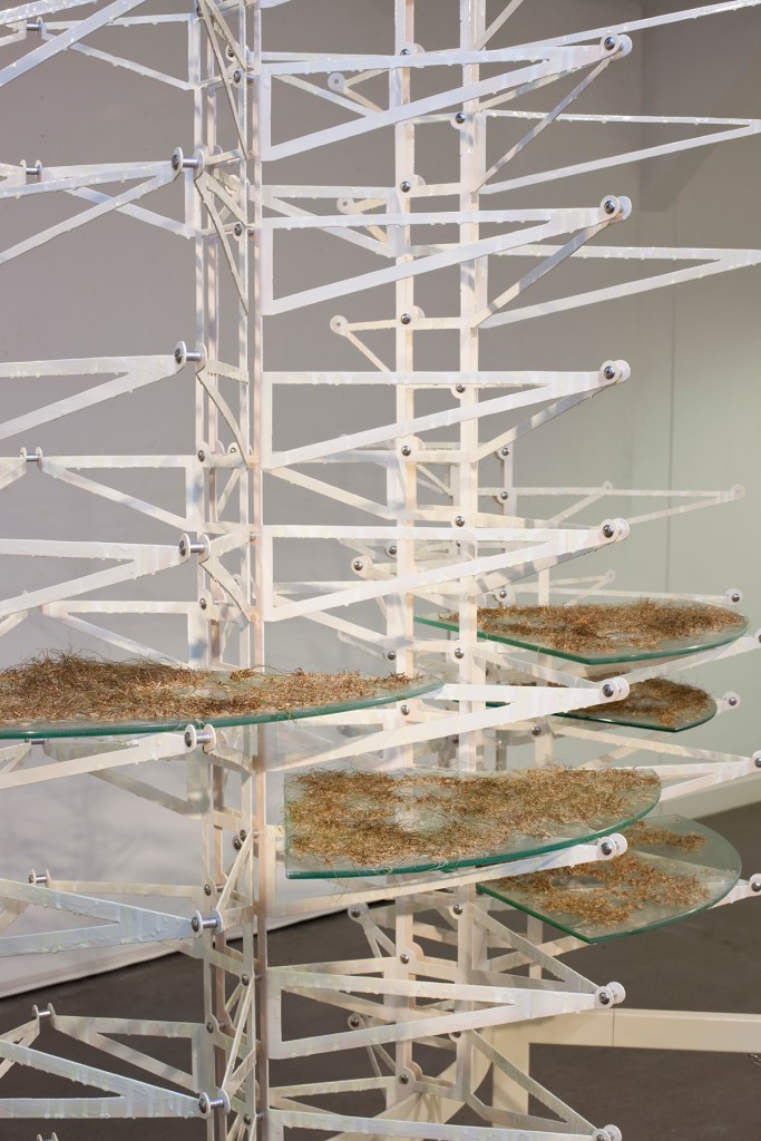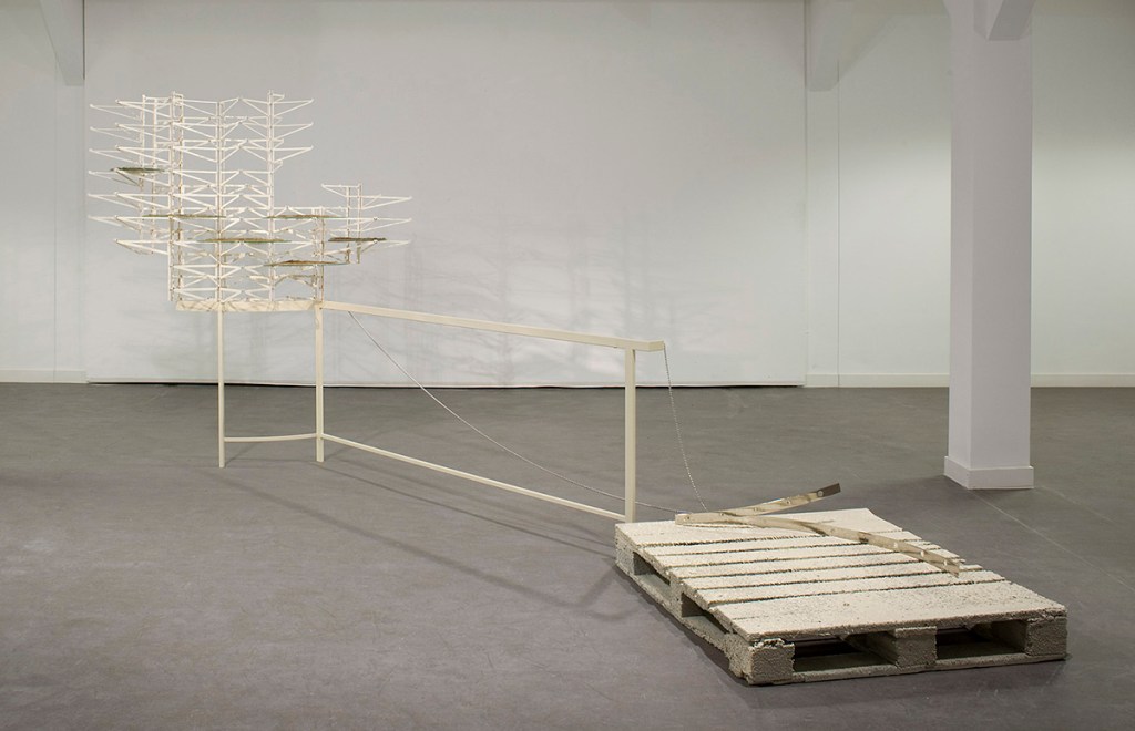 Mid-Atlantis Outro, 2012. Painted steel, glass, pallet, nickel-plated steel, grass, chain, 180″ x 84″ x 72″